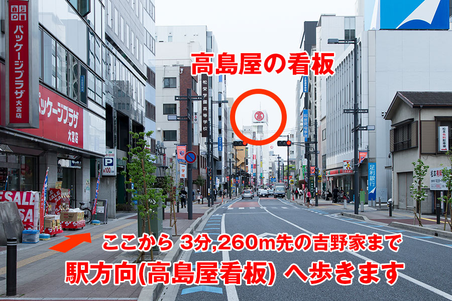 ②道路沿いを駅方向に歩くと、前方に高島屋の看板が見えますので、目印にこの方向に歩きます。ここから左折ポイントがある吉野家まで歩きます。3分程です。