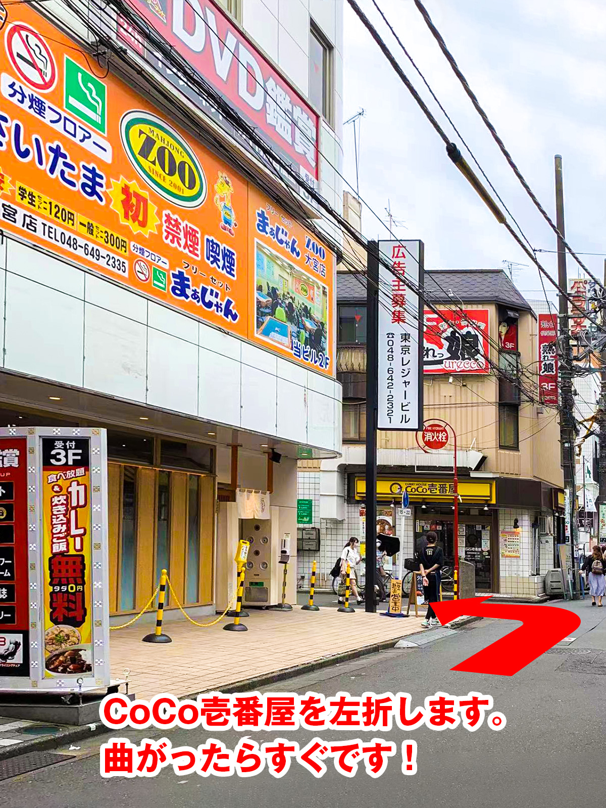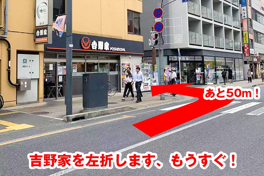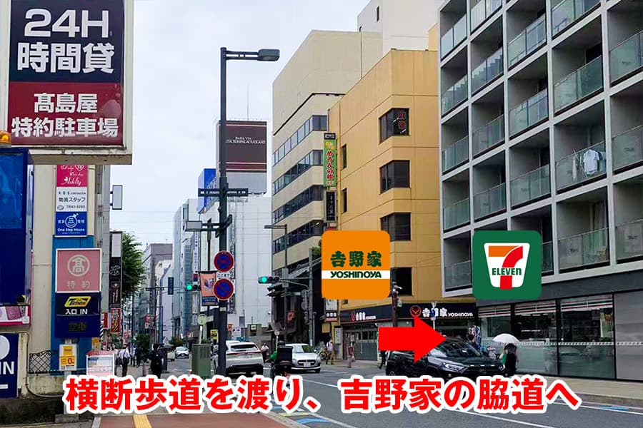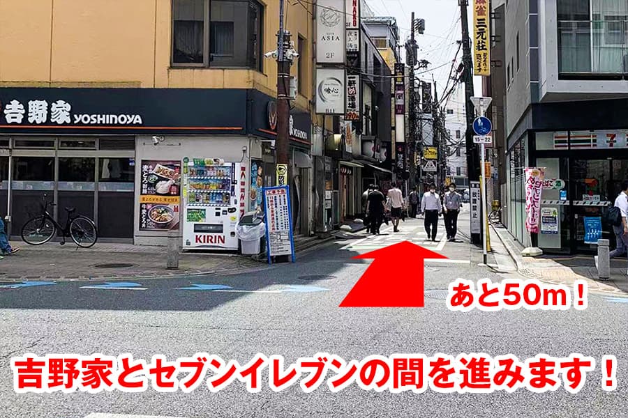 ③横断歩道を渡って、吉野家とセブンイレブンの間の小道をまっすぐ進みます。ここからお店まで50mくらい、1分もかからずすぐに当店の看板が見えてきます。