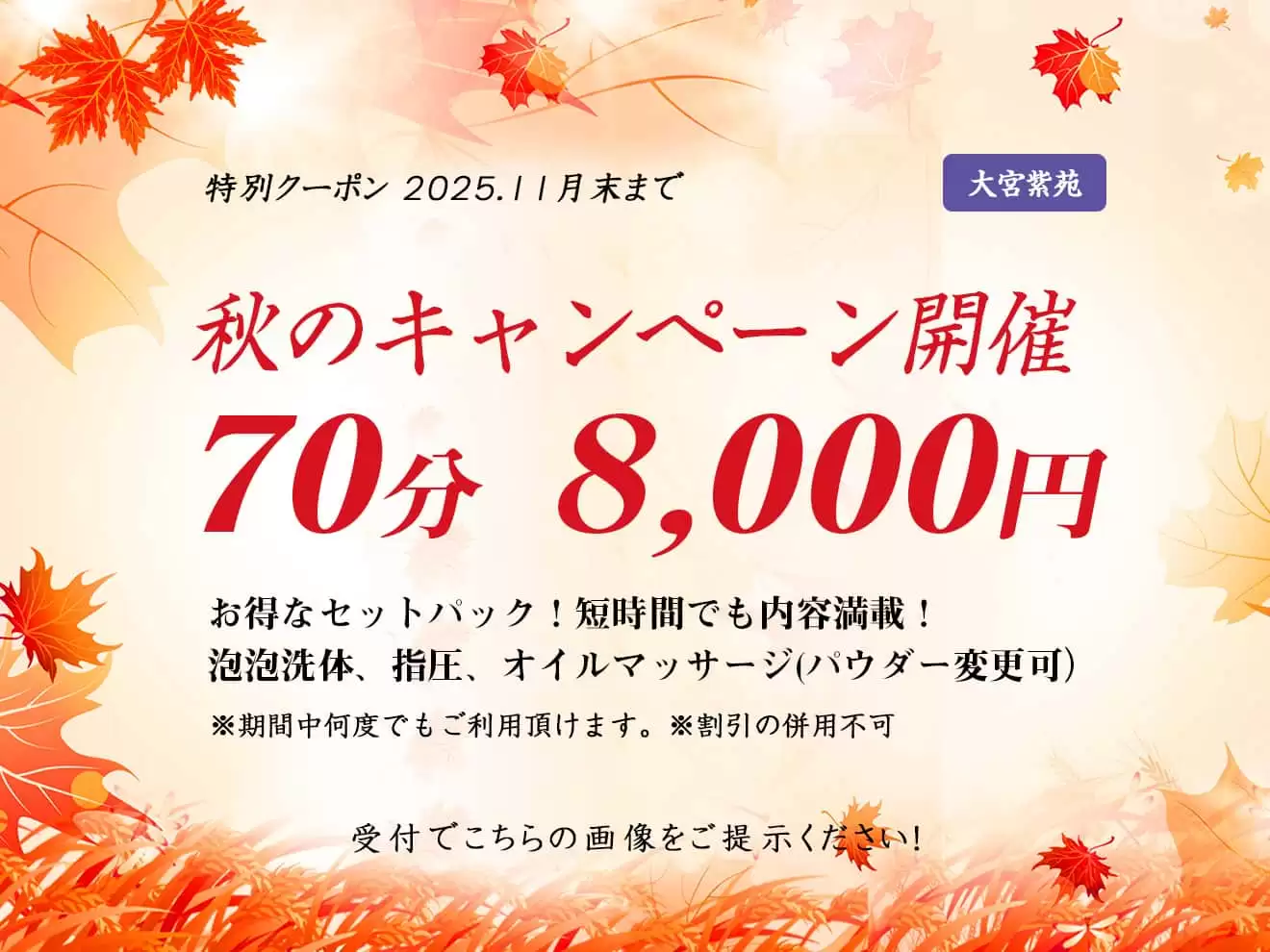 紫苑の信念は最高のリラクゼーションをお客様にご提供することです。お帰りの際に「ありがとう」、「気持ちよかった」と言って頂ける様に日々、精進とたえまぬ努力でスキルの向上に努めます。